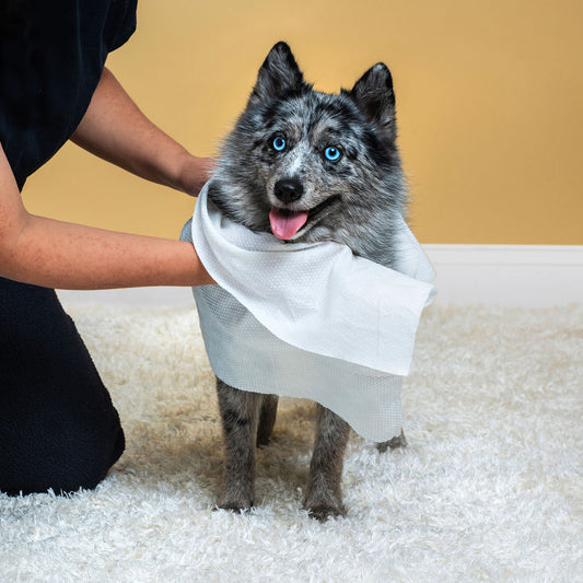 These grooming gloves are the perfect solution! My puppy would sit and let you scratch her all day if you had the time! I can sit and wipe her down and 'scratch/pet' her with the gloves on and she can't get enough of it! It is a win-win scenario.